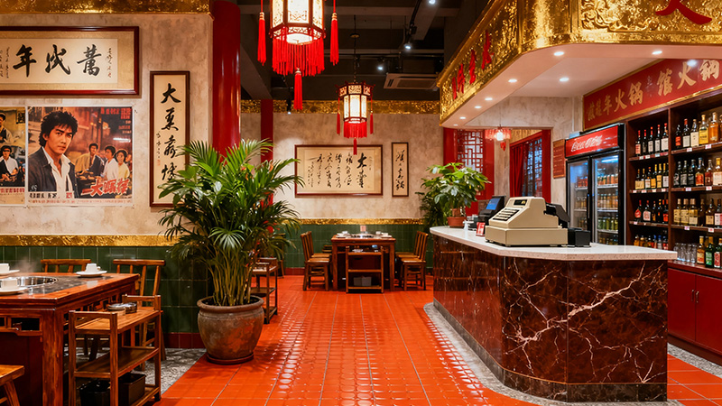 以紅色和金色為主色調,紅色大面積應用于柱子、燈籠和地面瓷磚,營造出熱烈、喜慶的氛圍,契合火鍋熱鬧的用餐場景;金色作為裝飾線條和天花板圖案的顏色,提升了空間的華麗感與檔次。通過傳統字畫、復古海報、中式燈籠等元素,營造出濃厚的復古懷,讓顧客仿佛置身于過去的時光,增添用餐的趣味性和體驗感。