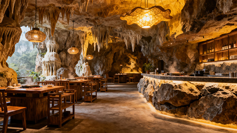 洞穴頂部和地面生長著形態各異的鐘乳石和石筍,這些自然形成的景觀是店內最獨特的裝飾元素,極大地增強了洞穴的真實感和神秘感。大面積保留和利用天然巖石,展現出原始的質感和紋理,是整個設計的核心材質,突出了洞穴主題。
